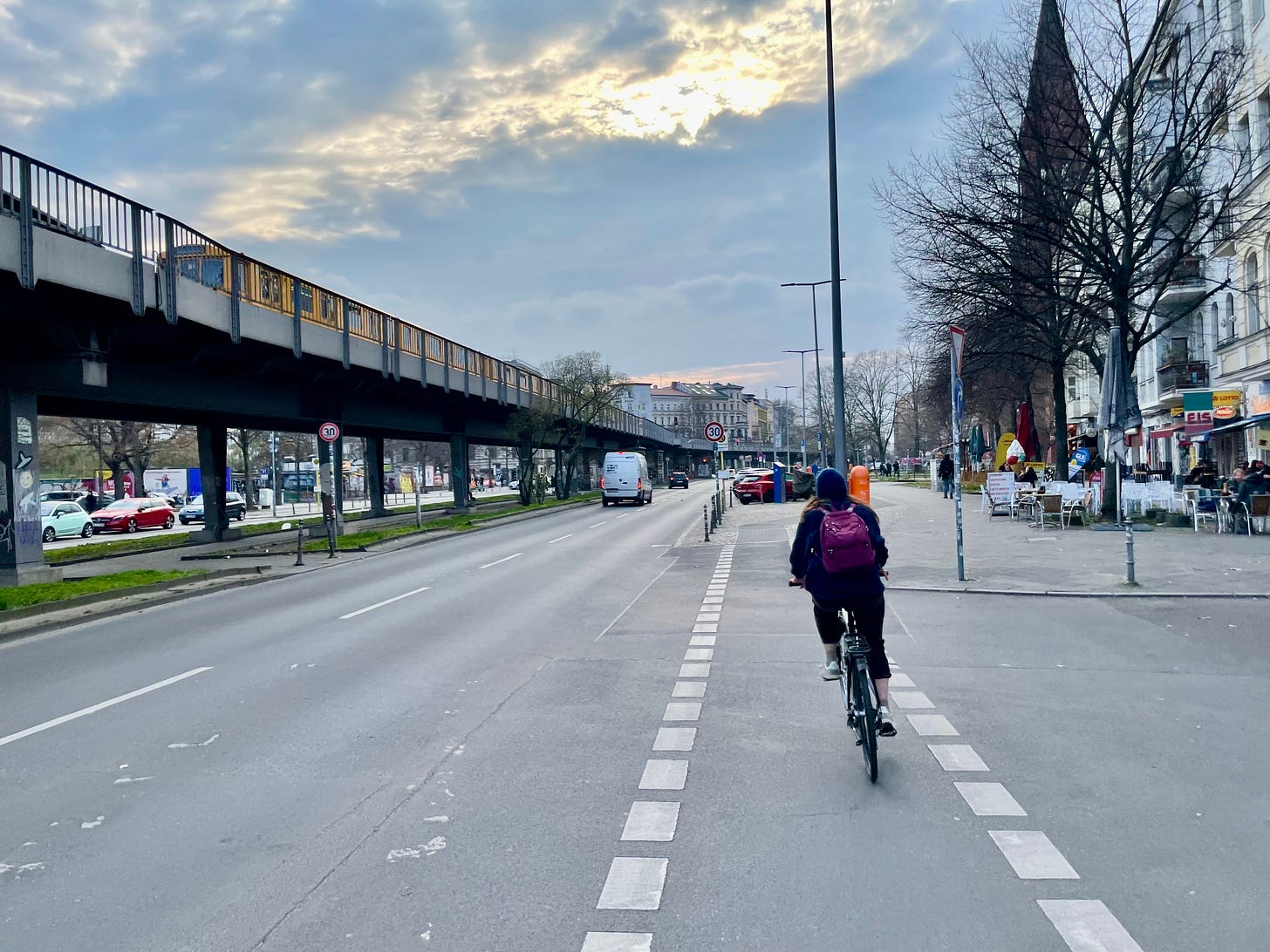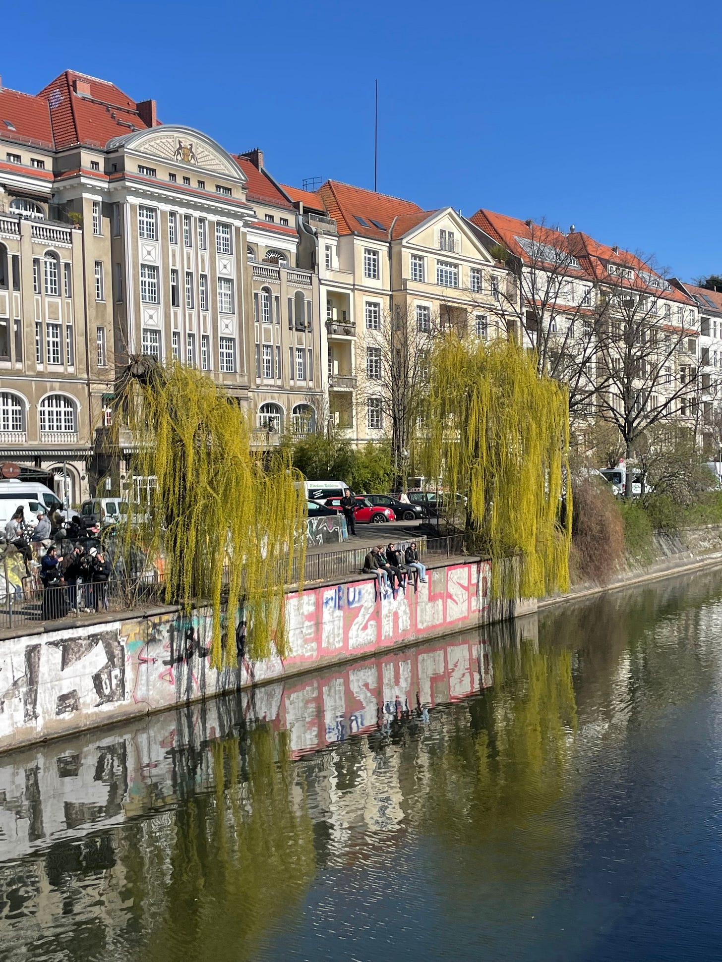 As I often do following a trip, I posted a few photos of my recent visit to Germany: biking beneath the elevated tracks at Schlesisches Tor as a train approached; bright green willow trees along the canals of Winterhude in Hamburg, people sitting on the graffitied banks of the Kreuzberg canals in Berlin; a panoramic view of the carnival and from the roof of a renovated bunker in St. Pauli, a man hauling twenty giant crates of beer across the street along the cafes of Gräferstrasse.